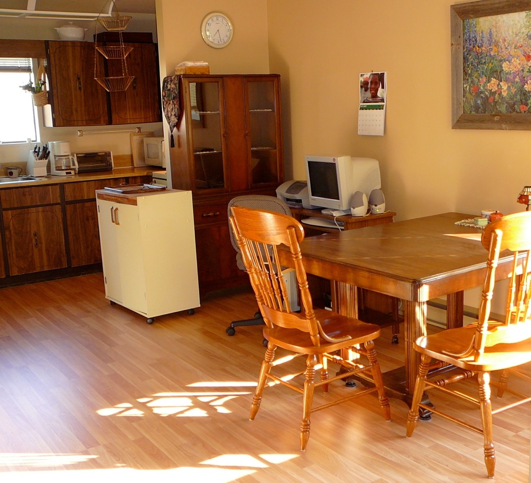 This poem was first published in 2009, in River of Words, a collection of poems by members of the MSA Poets Potpourri Society. It was inspired by our move in 2007. The photo, above, is our kitchen / dining-room just after we covered the old linoleum with new flooring. (You’ll notice I wasn’t kidding when I talk about that knickknack diet. We were well into packing by this time; even the shelves of the china cabinet were bare!)