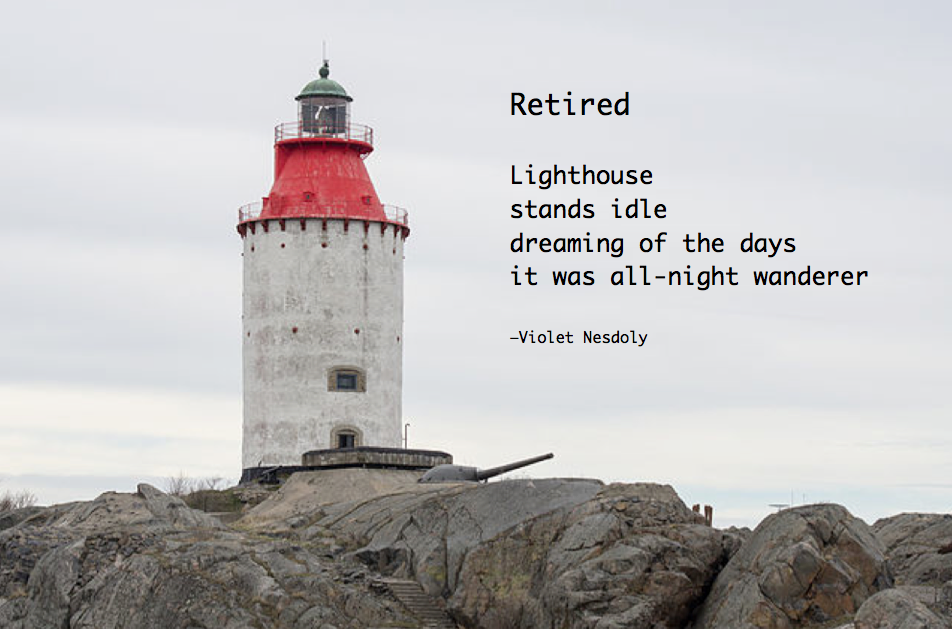 This week’s 15 words or less poem prompt is this lighthouse photo. It appears on “15 Words or Less Thursday: Lighthouse” at Laura Purdie Salas. Read the comments to see a slew of creative responses.