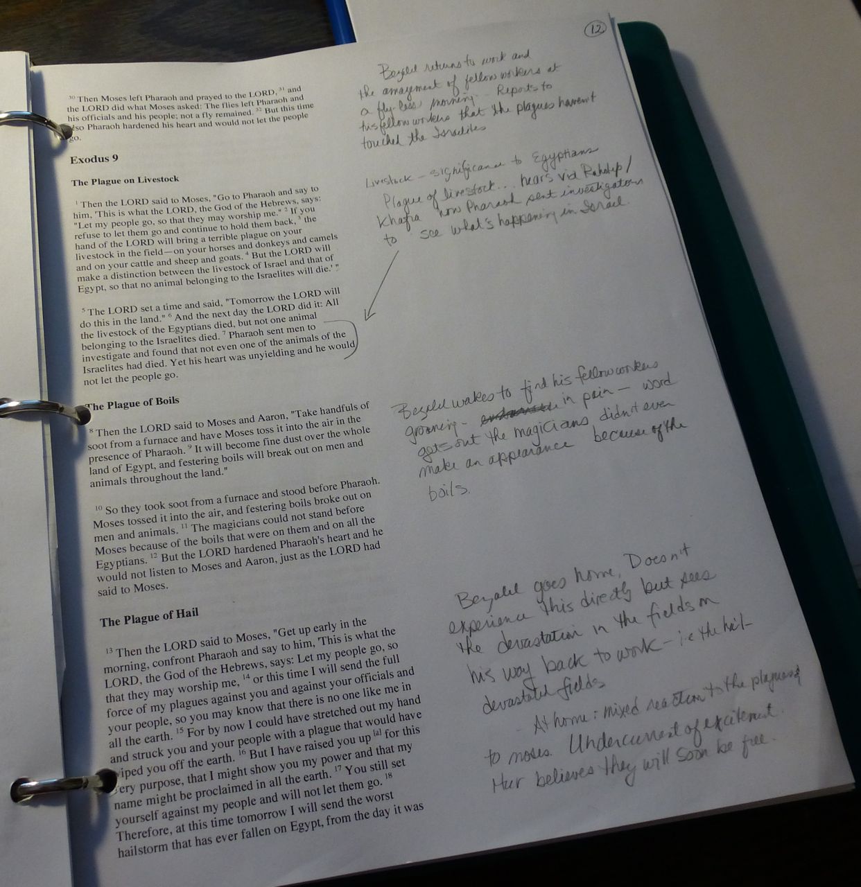 3. Since my story was Bible fiction it had events that needed to occur in a specific order. I made a document of the Bible script of events, formatting it with the print filling the left half of the page, leaving the right half blank for my notes. When I got ideas of how my character would handle these events, I made jottings on the right.