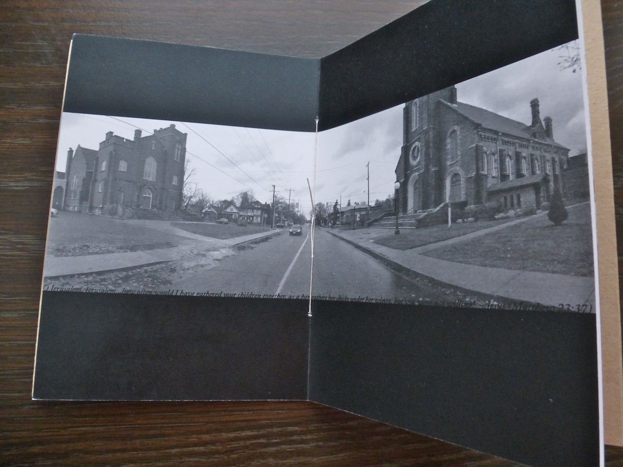The cover (which extends and folds into bookmark flaps front and back) opens to an inner cover which is a black-and-white photo. It’s a street scene and just visible on the left is the steeple tower of a church. When I flip to the back cover, I see the rest of the church—a continuous photo with the front. On the flip side of the first photo is another church photo. It too continues on the inside of the back cover.