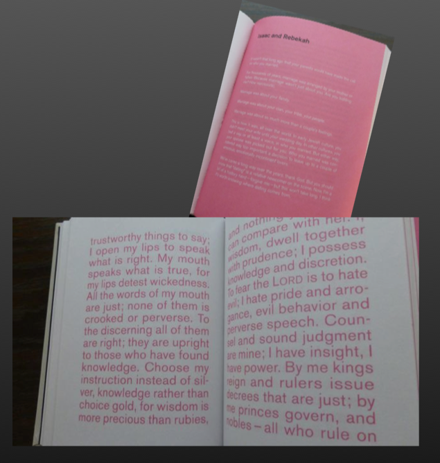 My one objection to the book is its physical design (I read the hardcover edition). The beginning page of each section is hot pink with white print. Talk about hard to read in any but bright daylight! I found myself dreading another pink page—a distraction from the book’s message for sure. As well, the footnote numbers are in hot pink, making them almost invisible. Also, long quotes from the Bible (Genesis 2:15-25 and Proverbs 8) serve as front and back bookends for the body of the book. These are in huge font (pink on white) with no spacing for verses or paragraphs. Again my eyes say NO!
