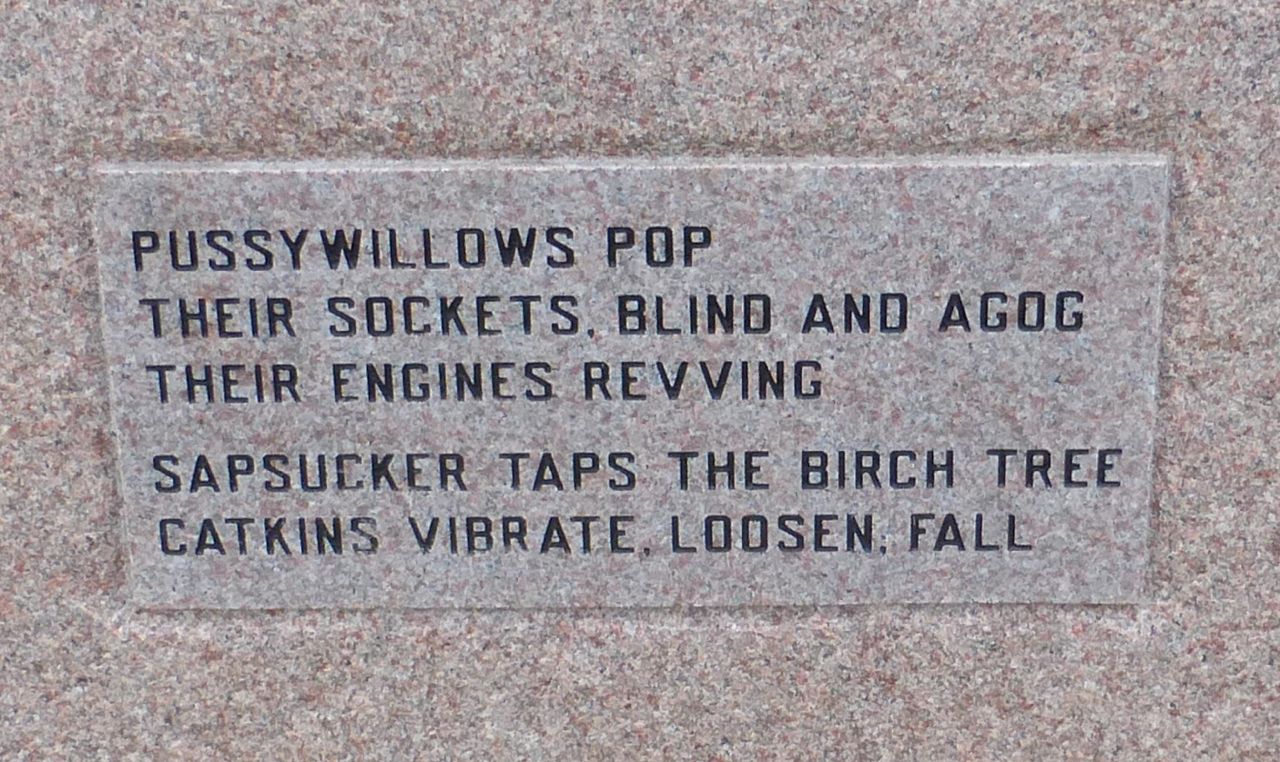 Part of the trail is lined with granite boulders onto which poems have been engraved. I found eight of these. All the poems are tanka, celebrating the seasons, flowers, birds and critters of the area.