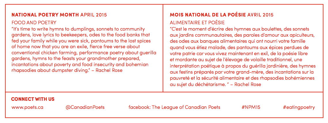 Share your food poems with other Canadian poets using the hashtags #eatingpoetry and #NPM15