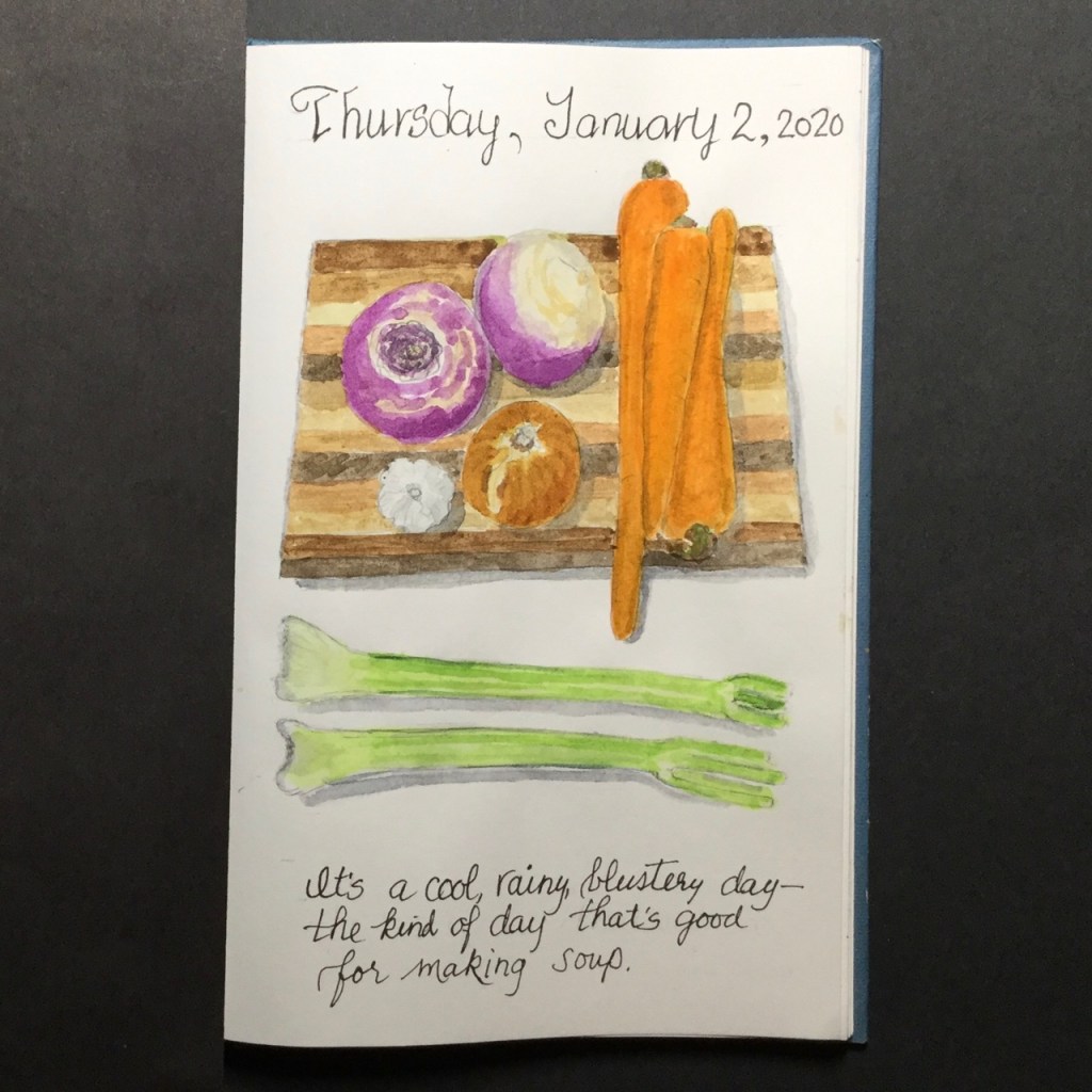 I’ve continued on with that practice this year. I use a simple 5.5×8” hardcover sketchbook from Michaels. It’s made of 75 lb. paper (not even mixed media weight), not meant for watercolours, but I use them on it regularly and it holds up remarkably well with never a bleed-through (unless I rub the paper raw).