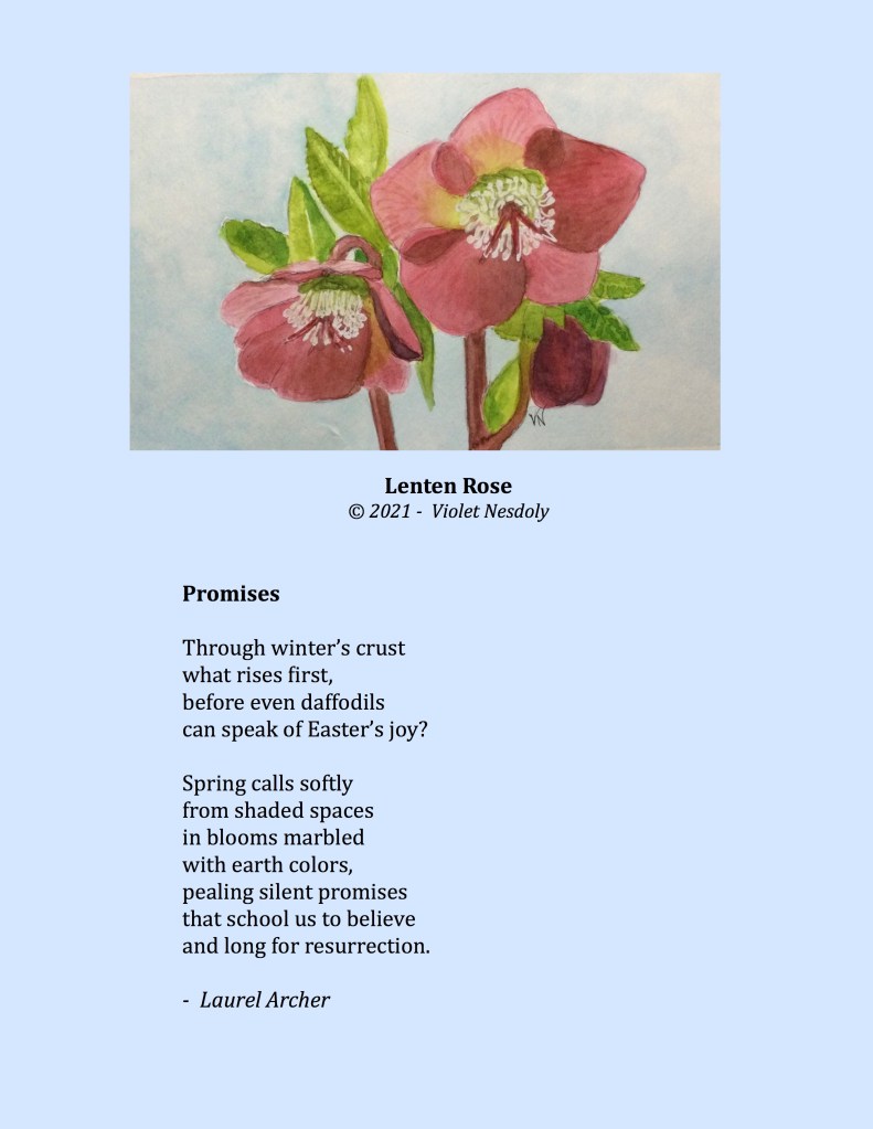 Painting: “Lenten Rose” – © 2021 by Violet Nesdoly, Watercolour on 140 lb. cold press watercolour paper, 9×12 inches