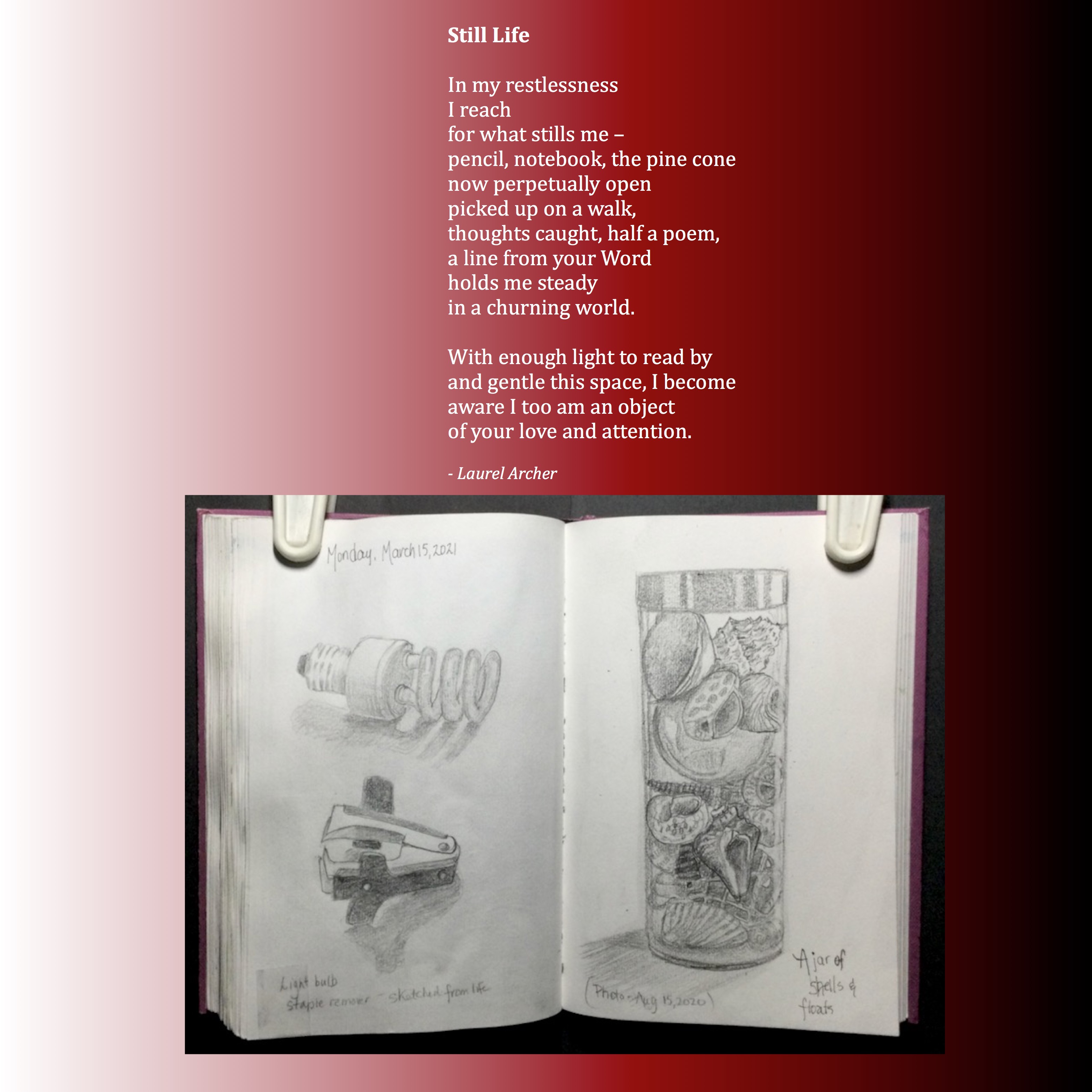 When I read “Still Life,” I thought immediately that something simple, like a pencil sketch, would suit Laurel’s humble expression of faith. The thing was, I had done a couple of pencil sketches the very night before. The clincher that my sketches were the right response to her poem—she speaks of light in her poem, and one of the things I happened to sketch was a light bulb!