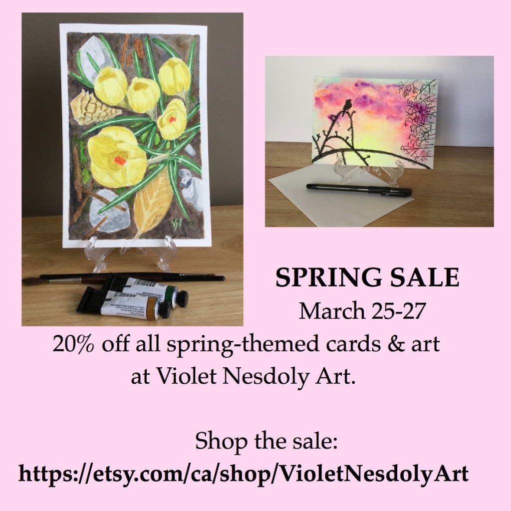 I’m having a Spring Sale in my shop VioletNesdolyArt! Get 20% off all spring-themed cards and paintings, today (March 25) and tomorrow (sale ends at midnight, March 27th).