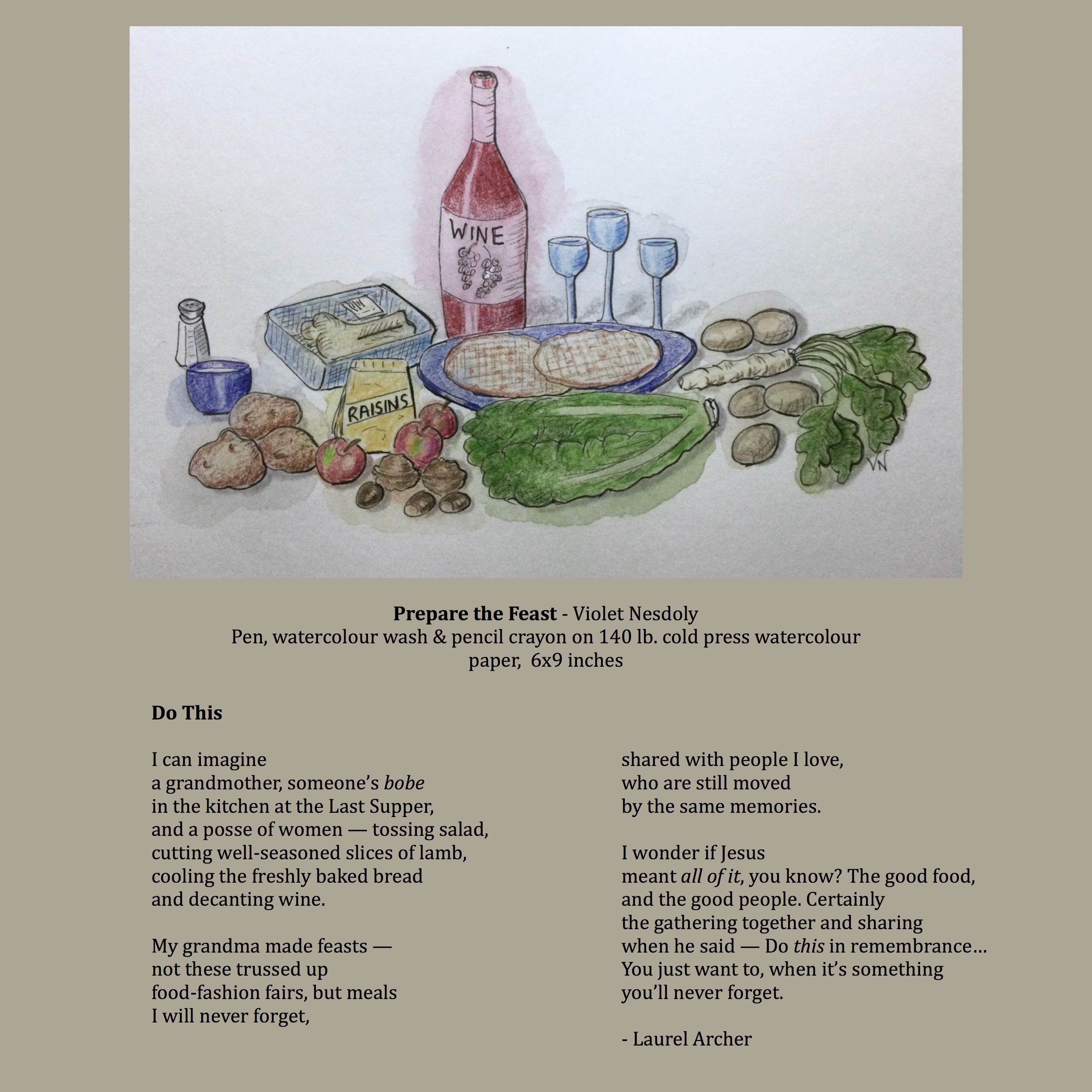 Laurel responded to my art prompt by taking it home, literally, with her poem “Do This” about the wonderful meals of remembrance that we’ve all experienced—weighty with spiritual and emotional significance. Because of pandemic restrictions, we’ll miss eating an Easter meal with our loved ones this year. It has made us appreciate such memorable occasions all the more.