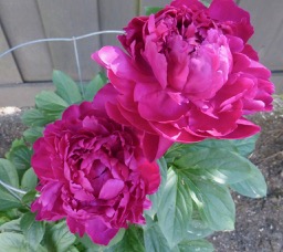 I was excited to see a peony in bloom in the back garden of our current property when we first saw it back in June of 2007. That magenta peony bloomed beautifully for a few years and then mysteriously stopped blooming, eventually shriveling away to nothing. I blame the encroaching roots of trees that line the walkway behind us and the gloomy shade their branches cast over the garden.