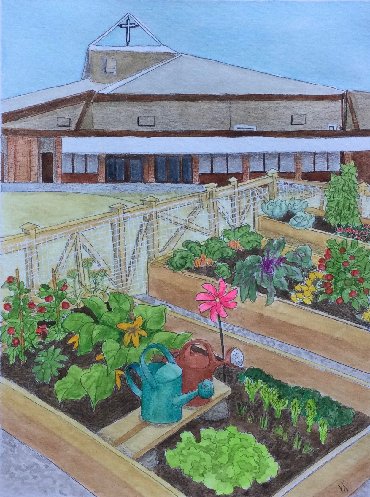 Last summer the community outreach coordinator at our church had the idea to build and plant a community garden right on church property. It was a lovely spot, which I couldn’t resist painting.