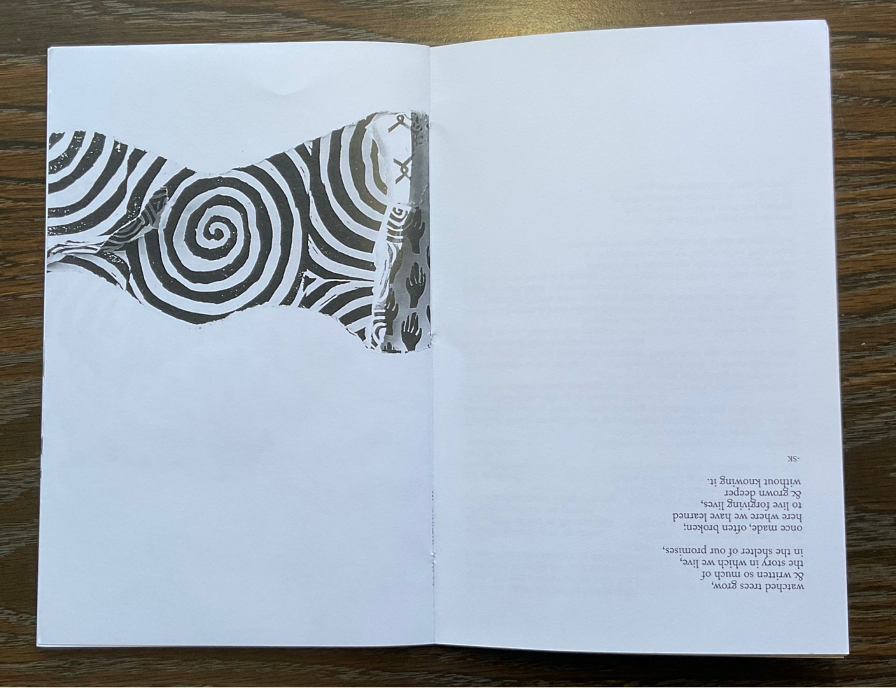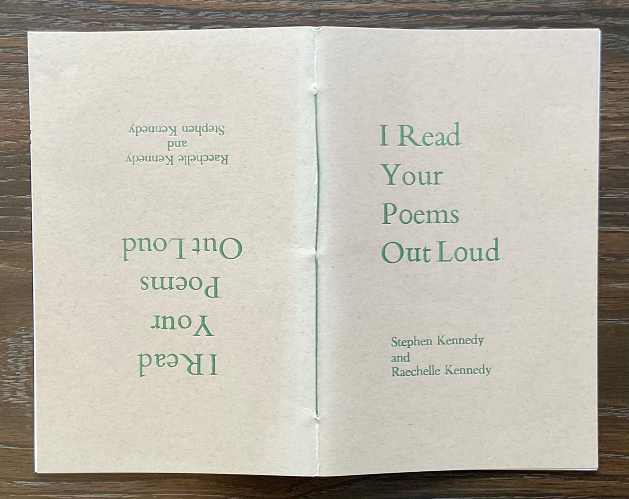 Physically the book is a little piece of Kennedy family art. Under a tan cover, with green embossed lettering, the two halves of the book are typeset opposite each other with a ribbon of graphic art (by Stephen’s sons) flowing throughout, giving a sense of unity. The book is held together by green yarn, hand stitched by another daughter.