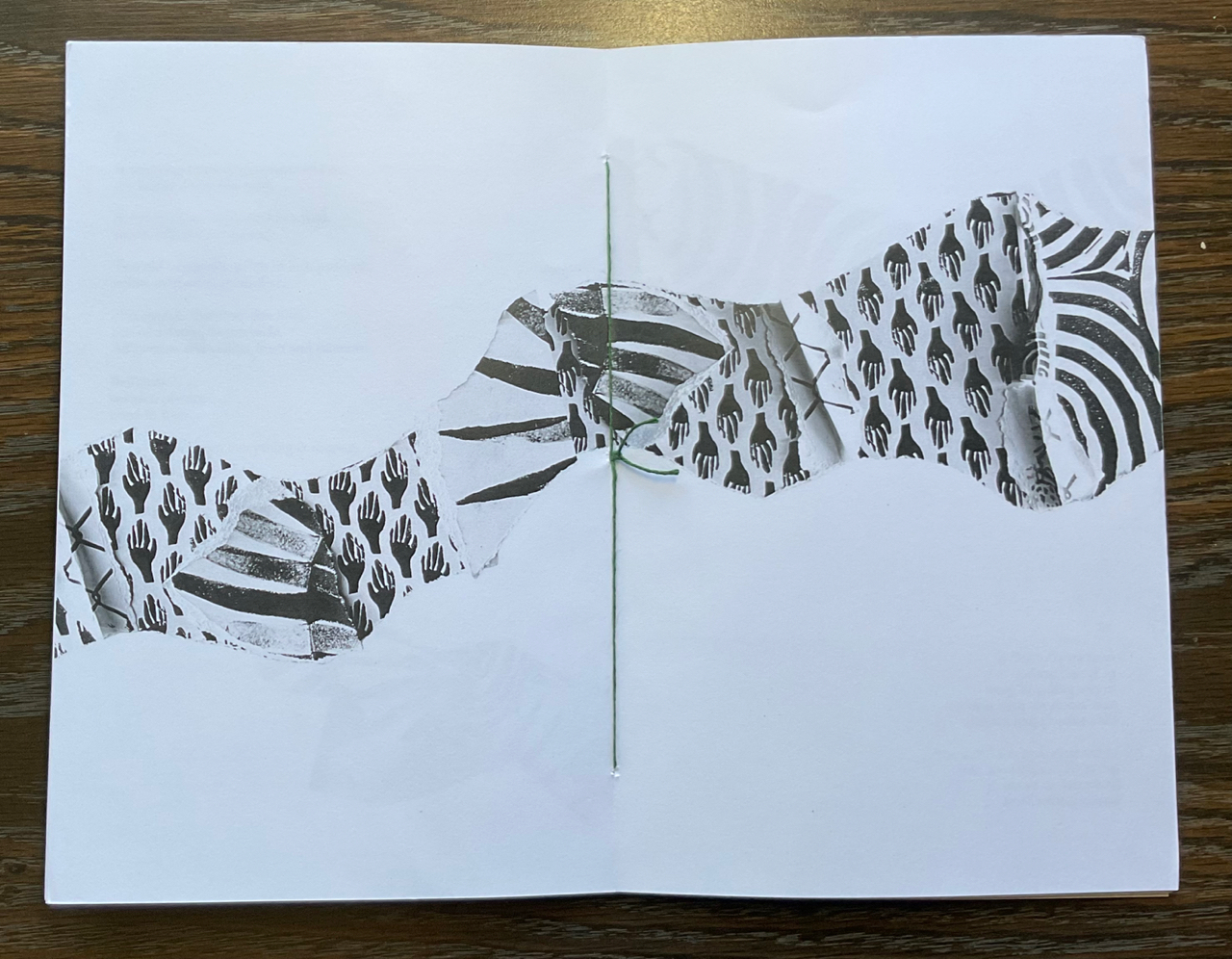 A graphic ribbon unites the two sections of the book. The green stripe down the middle image is green yarn — hand-stitching at the center of the book.