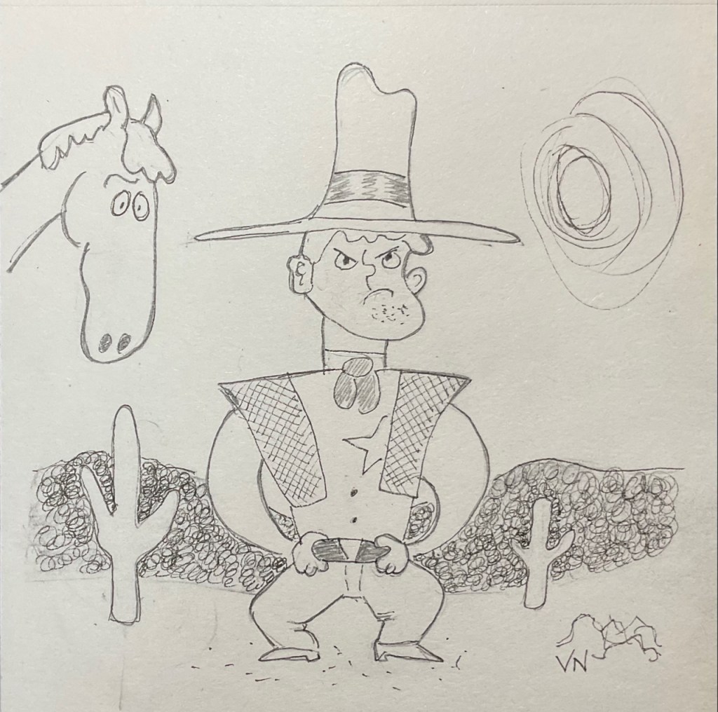 PROPORTION – Copy of a cartoon cowboy, Humongous Book of Cartooning by Christopher Hart. Pencil on paper, 6 x 9 inches.