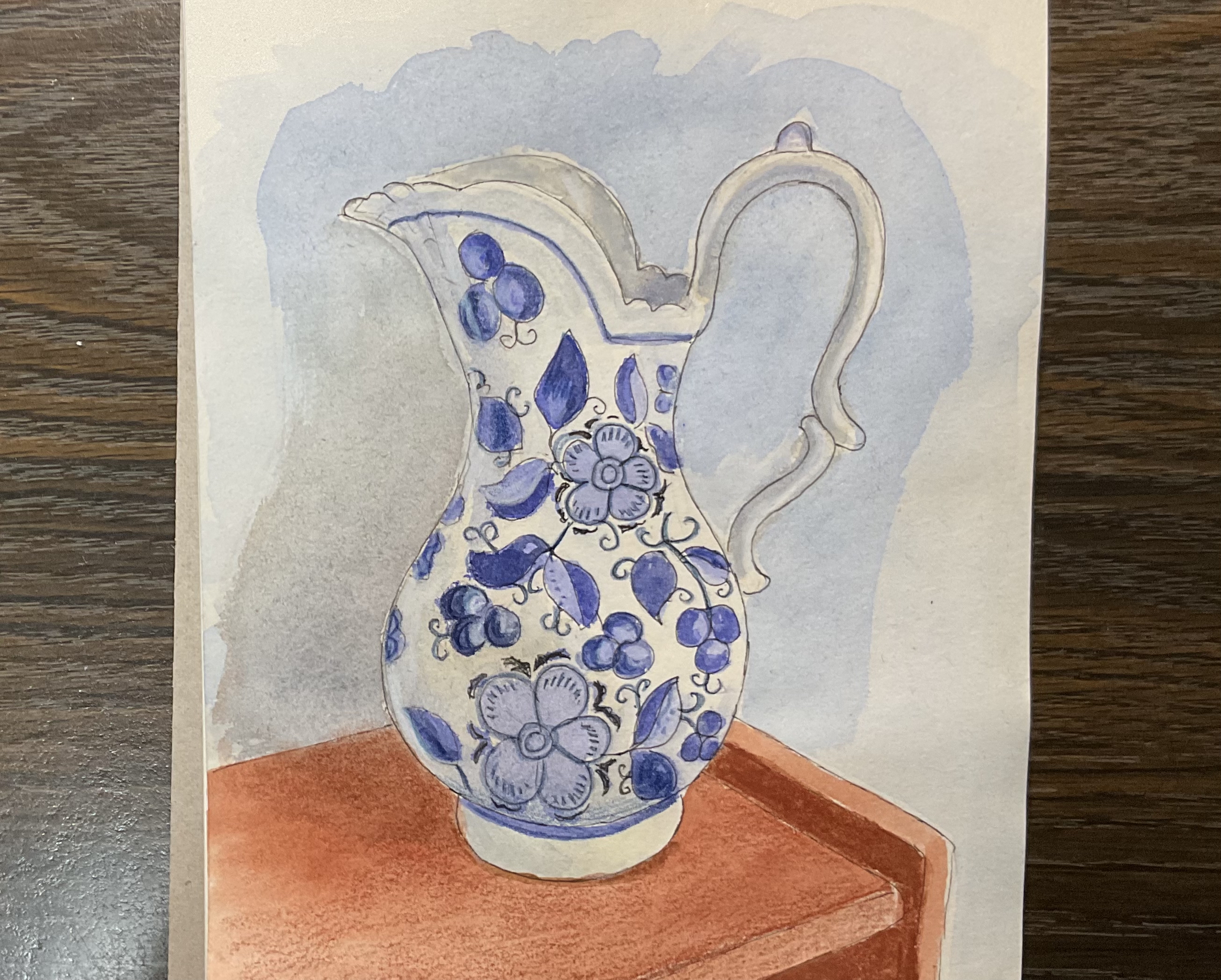 DETAIL – Delft Pitcher, pen, pencil crayon and watercolour on paper, 6 x 9 inches.