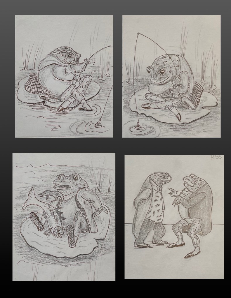 CHARACTER – Jeremy Fisher. These pencil sketches are copied from the Beatrix Potter book The Tale of Jeremy fisher.