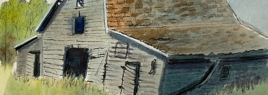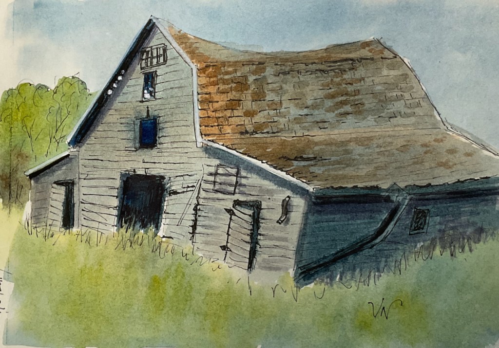 During a gathering of my husband’s family in 2011, we visited his uncle’s Saskatchewan farm site. The old barn looked shaky—not too many years left in it. Here is my pen and watercolour sketch of that barn.