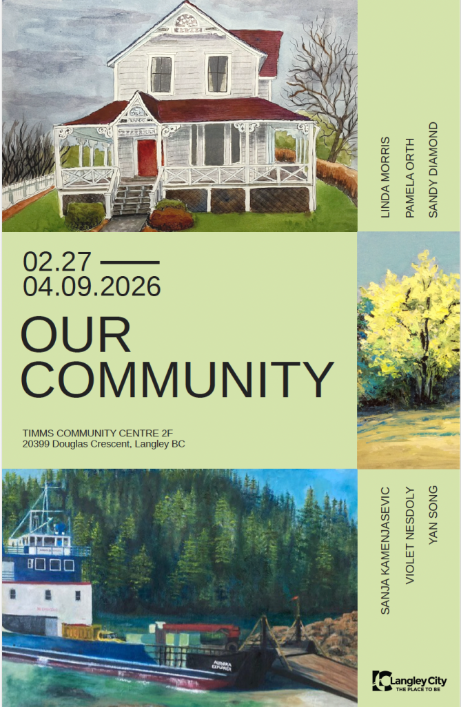 - February 27 – April 9, 2026 – Our Community Exhibition – Step Above Cultural Gallery, Timm’s Community Centre, Langley, BC